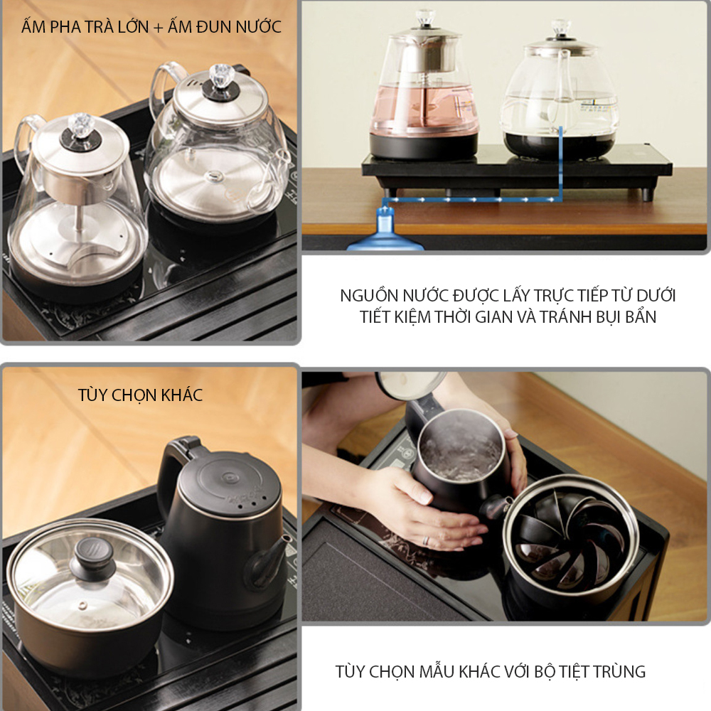 Khi mua bàn trà, tặng kèm bộ ấm trà thủy tinh, ấm đun, bếp điện và bộ dụng cụ pha trà, giúp bạn có ngay một góc trà đầy đủ chỉ trong một sản phẩm.