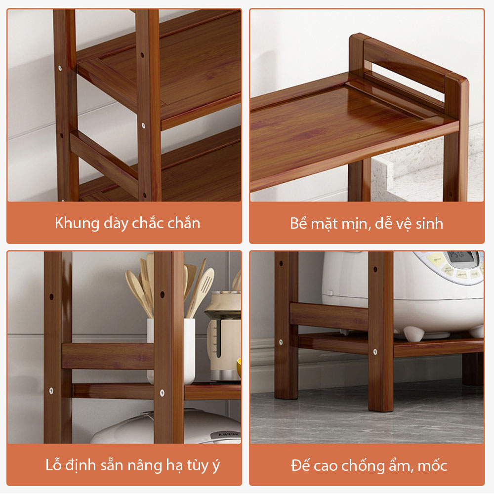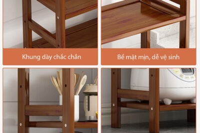 - Khung sườn chắc chắn: Khung kệ được làm từ gỗ tre dày dặn, chịu lực tốt, vừa chống mối mọt lại không lo cong vênh hay rung lắc. Yên tâm “chất đầy” đồ mà không lo bị sập xệ.