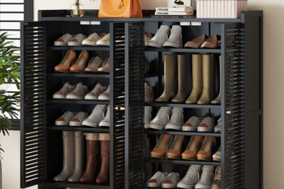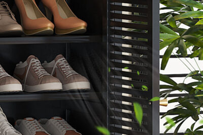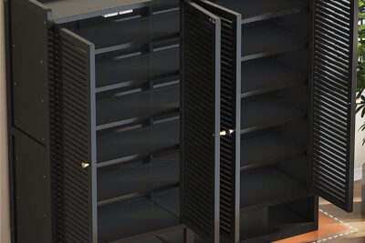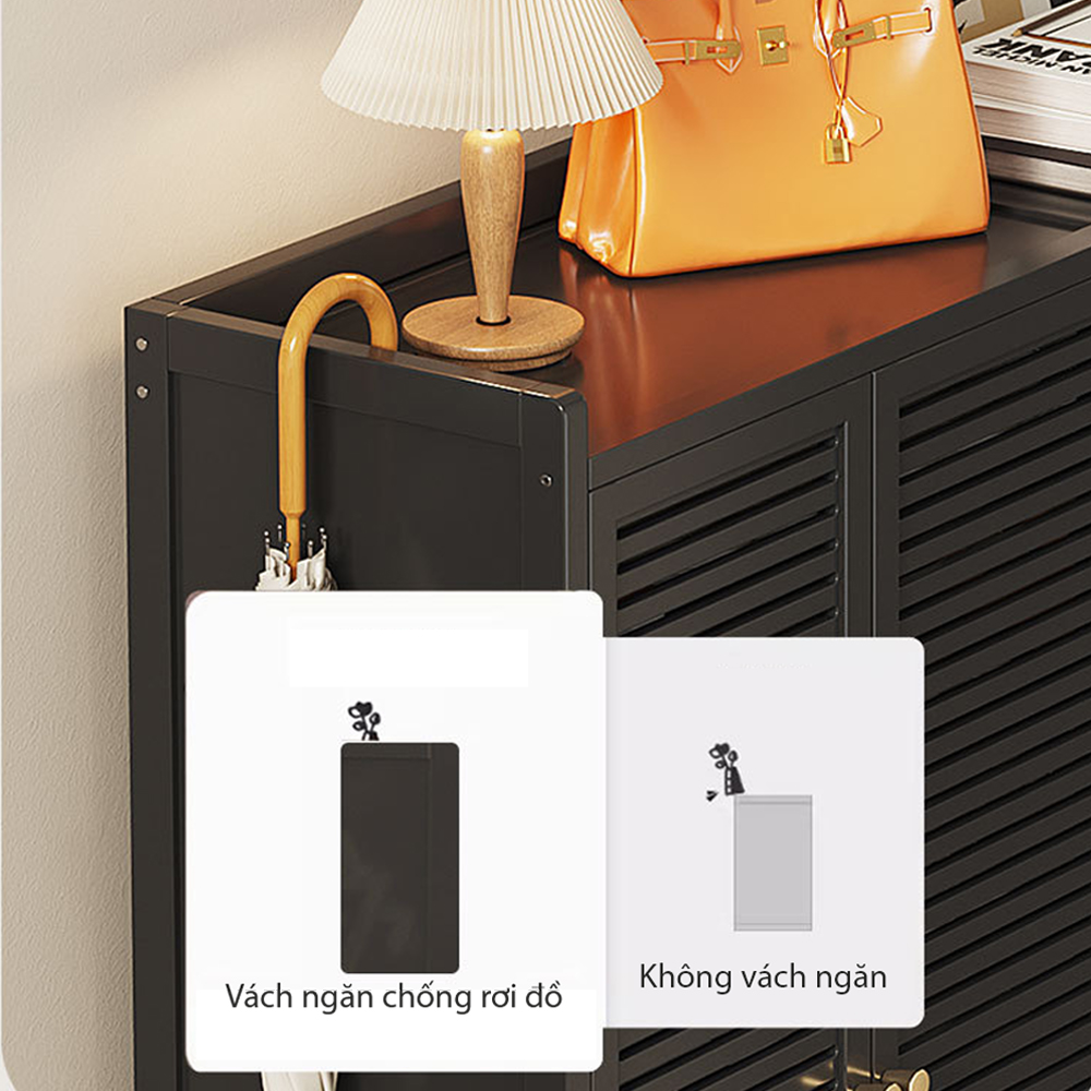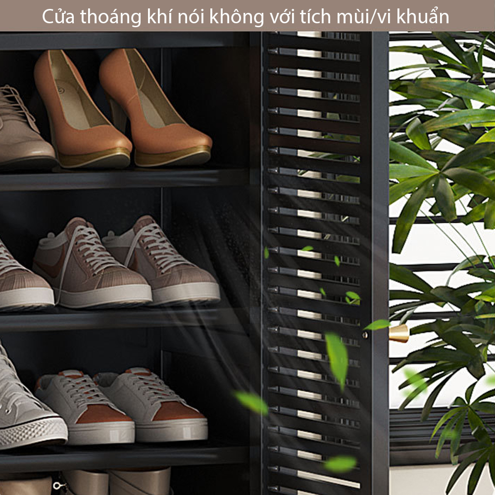 Tủ được thiết kế cánh nan ngang tạo độ thoáng, giúp giày dép khô ráo, hạn chế mùi khó chịu. Cấu trúc chia tầng khoa học, đặc biệt có ngăn riêng để bốt cao cổ, giúp giữ dáng giày và sắp xếp gọn gàng.