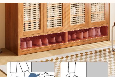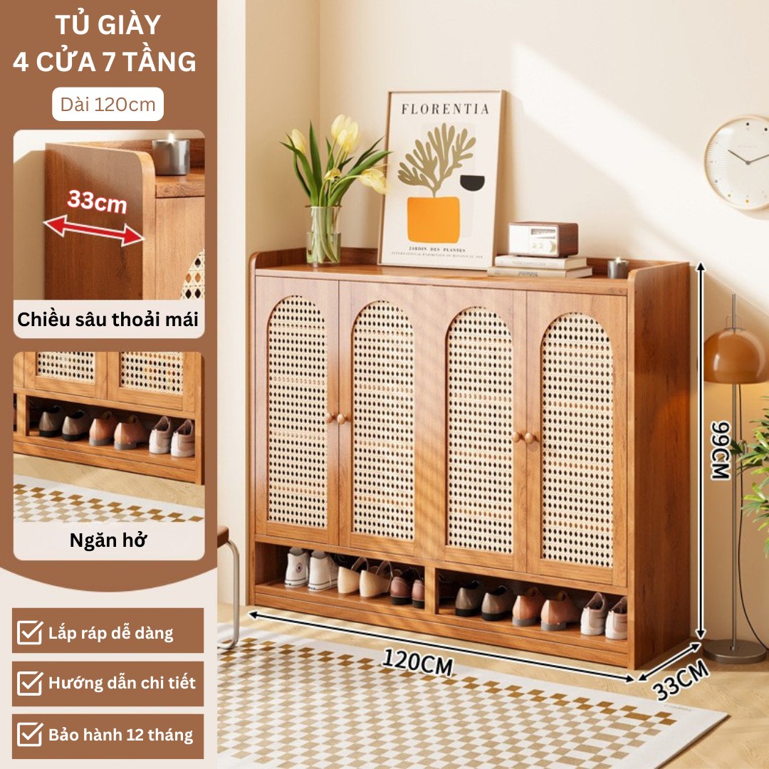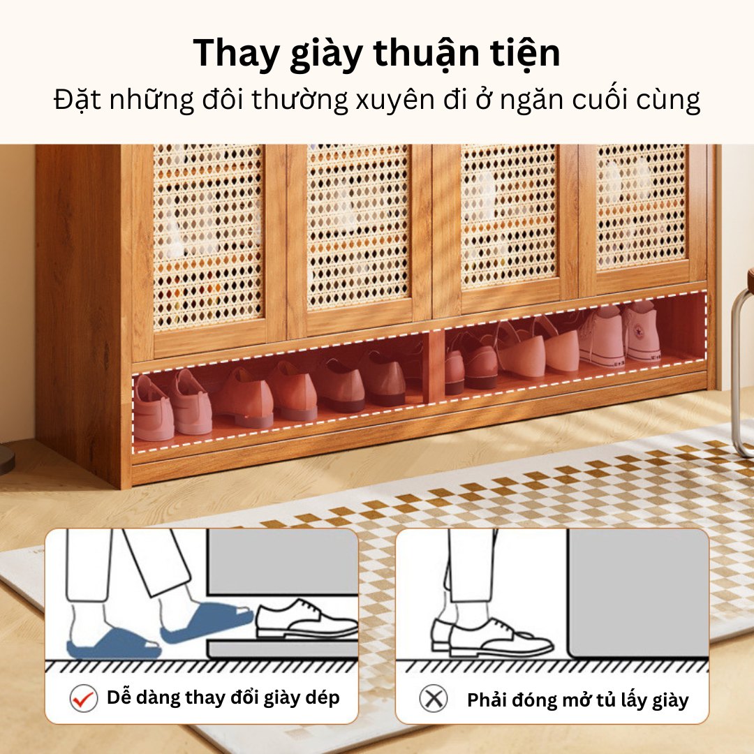 🌿 Sức chứa lớn, phân tầng thông minh: Các tầng tủ giày gỗ tre cánh mây rộng rãi, thoải mái sắp xếp từ giày sneaker, giày cao gót đến bốt cao cổ mà không lo chật chội.